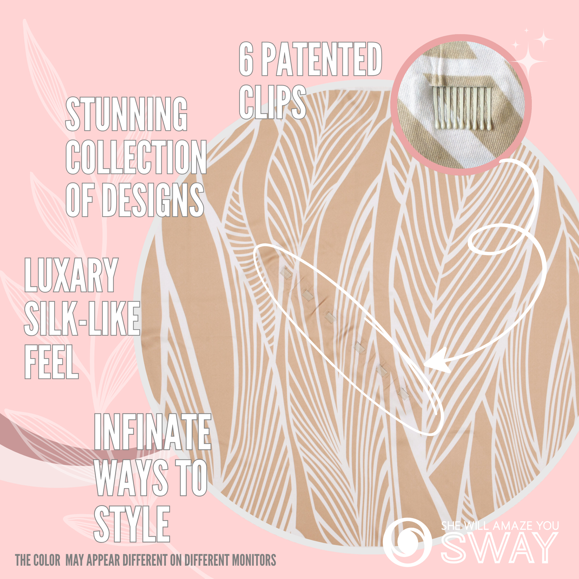 The embodiment of elegance and innovation – the patented SWAY large satin scarf headband! Unlock the gateway to endless possibilities and elevate your style to new heights with this revolutionary 6-clip system that ensures an impeccable hold, so you can confidently flaunt your flawless looks all day long.
