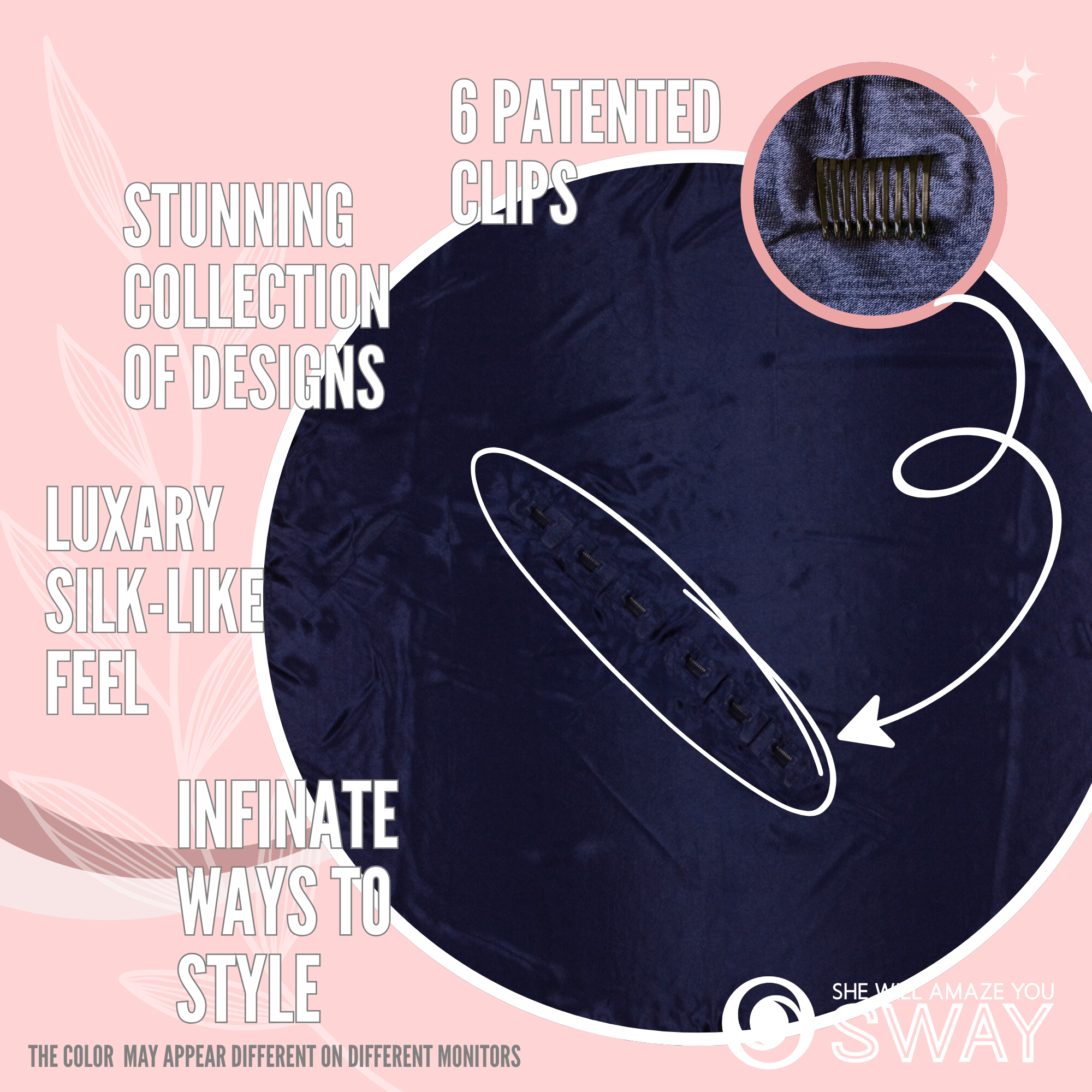Introducing the embodiment of elegance and innovation – the patented SWAY large satin scarf headband! Unlock the gateway to endless possibilities and elevate your style to new heights with this revolutionary 6-clip system that ensures an impeccable hold, so you can confidently flaunt your flawless looks all day long.