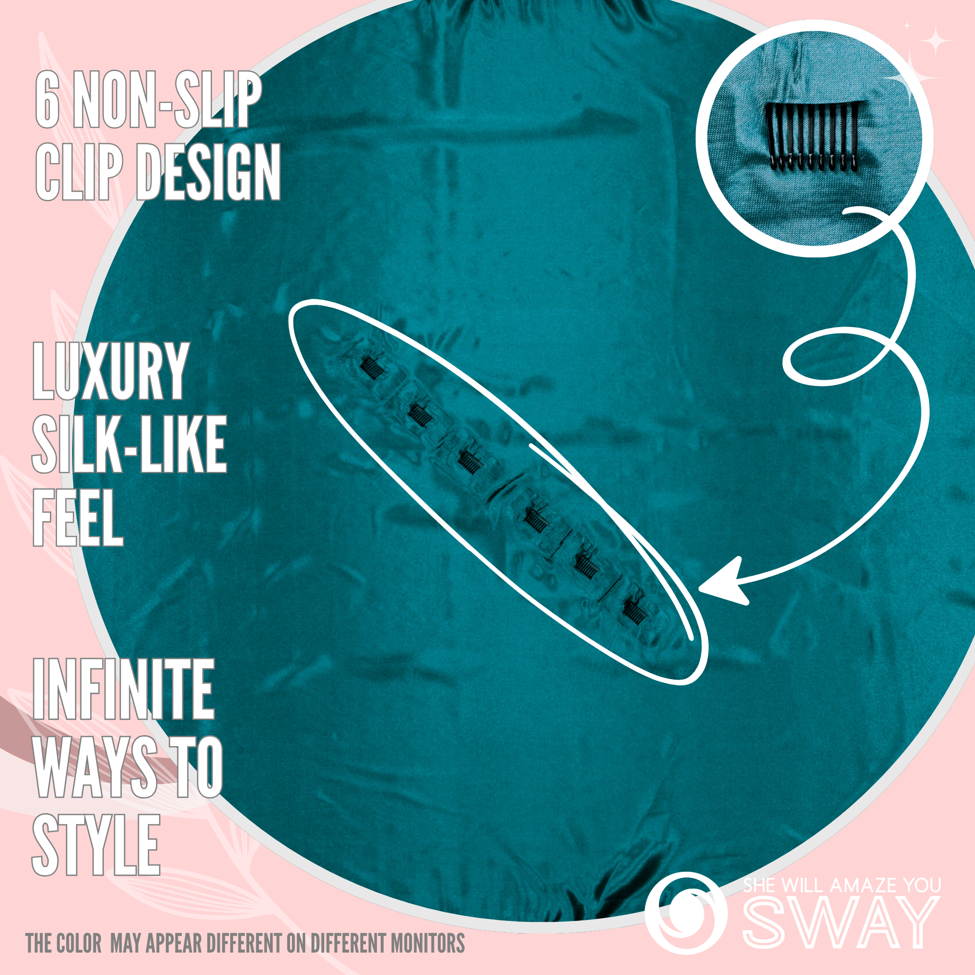 Introducing the embodiment of elegance and innovation – the patented SWAY large satin scarf headband! Unlock the gateway to endless possibilities and elevate your style to new heights with this revolutionary 6-clip system that ensures an impeccable hold, so you can confidently flaunt your flawless looks all day long.