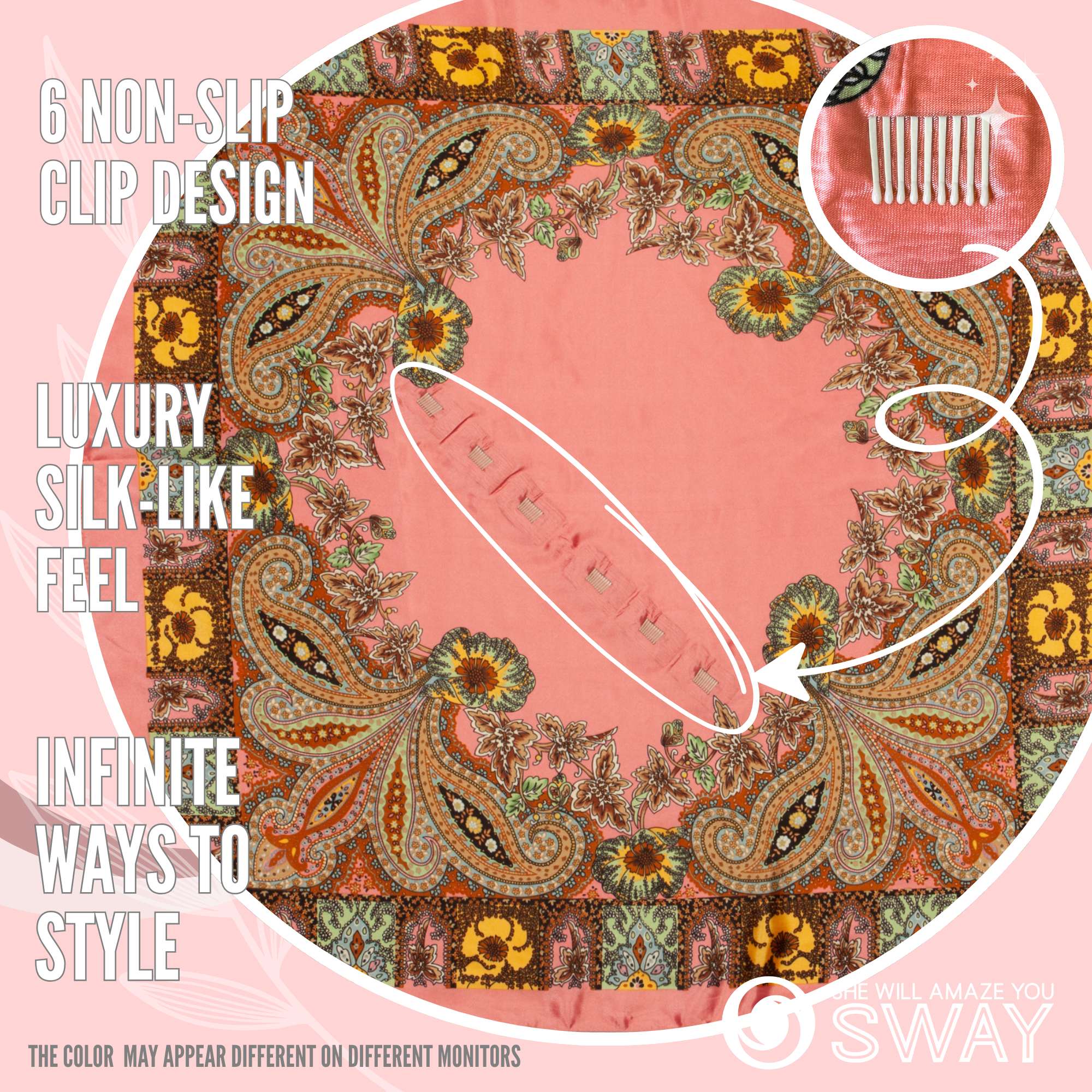Introducing the embodiment of elegance and innovation – the patented SWAY large satin scarf headband! Unlock the gateway to endless possibilities and elevate your style to new heights with this revolutionary 6-clip system that ensures an impeccable hold, so you can confidently flaunt your flawless looks all day long.