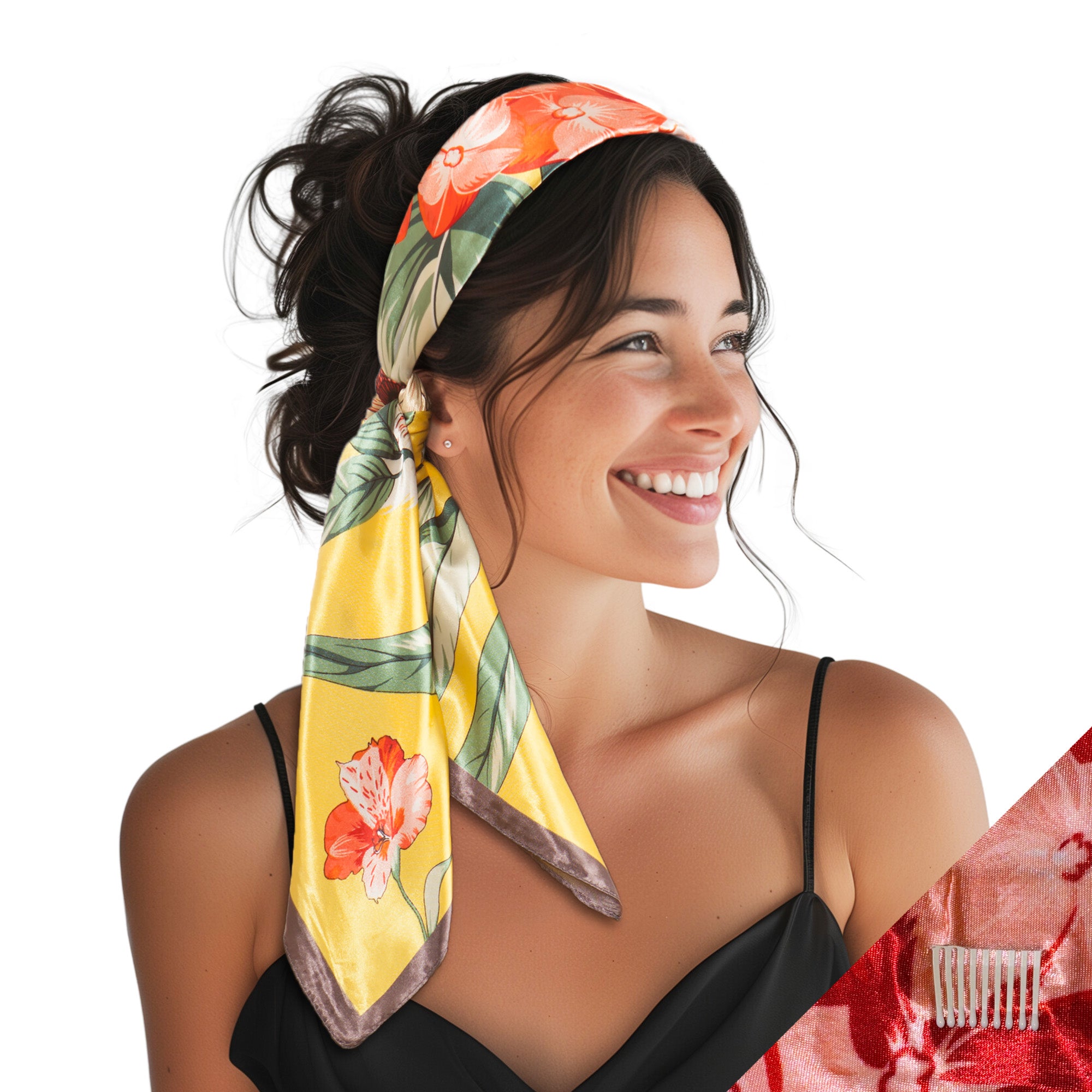 Introducing the embodiment of elegance and innovation – the patented SWAY large satin scarf headband! Unlock the gateway to endless possibilities and elevate your style to new heights with this revolutionary 6-clip system that ensures an impeccable hold, so you can confidently flaunt your flawless looks all day long.