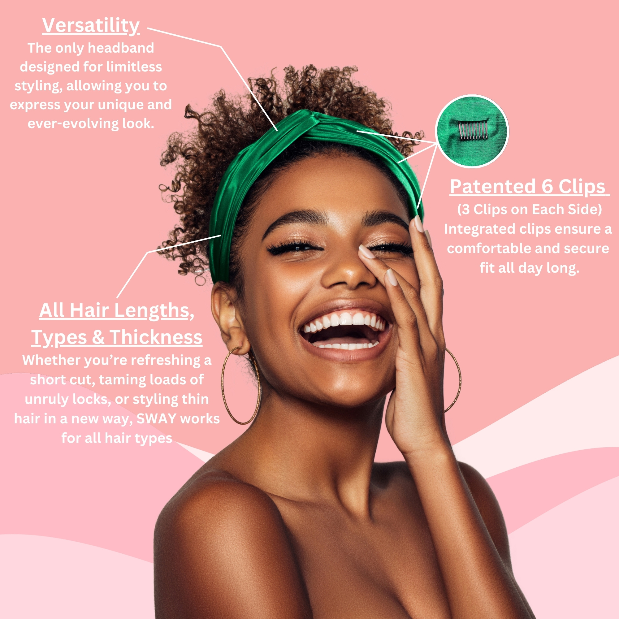 The embodiment of elegance and innovation – the patented SWAY large satin scarf headband! Unlock the gateway to endless possibilities and elevate your style to new heights with this revolutionary 6-clip system that ensures an impeccable hold, so you can confidently flaunt your flawless looks all day long.