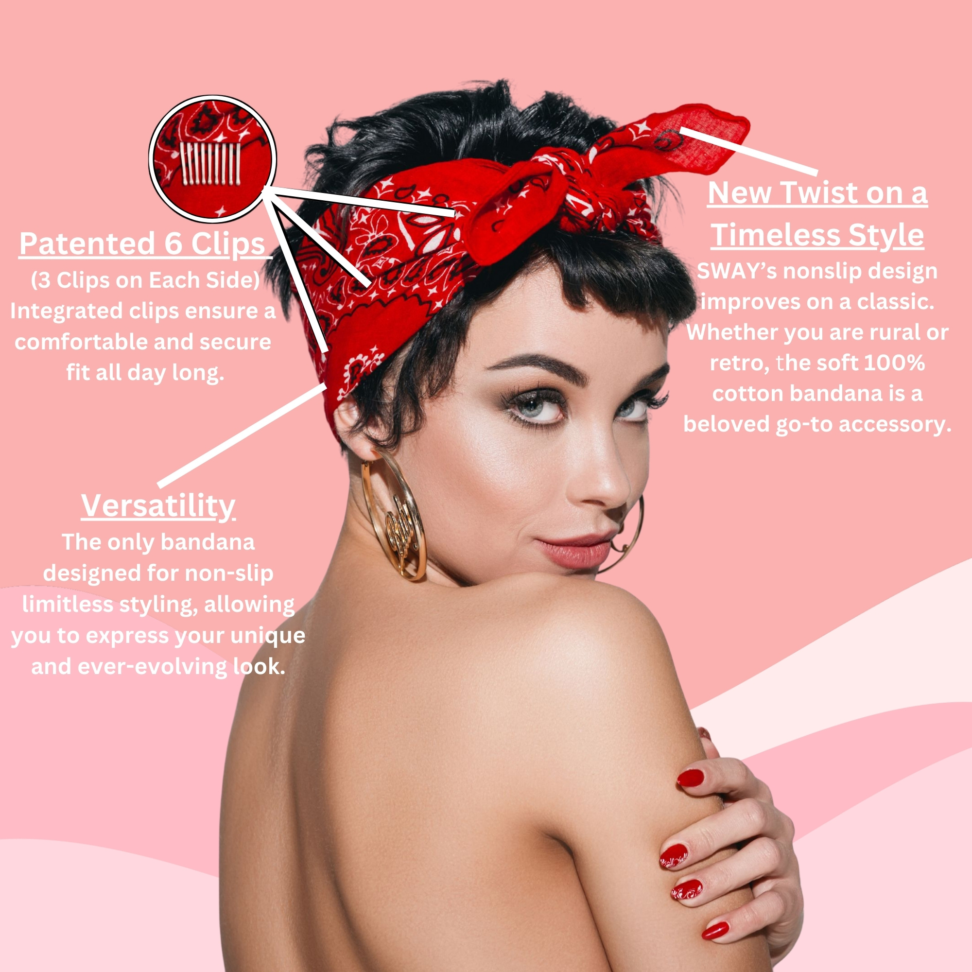 Perfectly suited for the fashionista or active individuals, SWAY's Cotton Bandana Headbands, with a patented clip system are the ultimate accessory to conquer your day with style and confidence. Whether you are trying to embrace your inner country girl or your coolest rockabilly vibe, this is the only bandana that will give you the fuss-free style that will never slip or slide and can be styled in endless ways